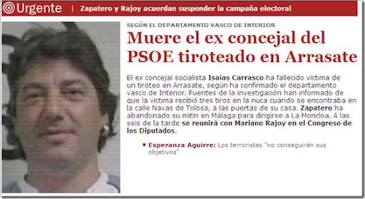 Un tiro en la nuca (como en los "buenos tiempos" del terrorismo etarra) ha acabado con la vida de Isaías Carrasco, de quien sinceramente no había oído hablar hasta esta nefasta noticia. Y más en concreto no ha sido uno sino tres tiros los que ha recibido el ex concejal del Partido Socialista de Euskadi. Todo un ejemplo de voluntad para dejar las armas.