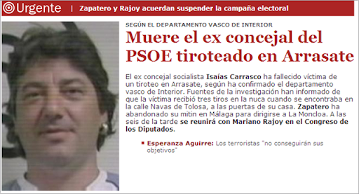Un tiro en la nuca (como en los "buenos tiempos" del terrorismo etarra) ha acabado con la vida de Isaías Carrasco, de quien sinceramente no había oído hablar hasta esta nefasta noticia. Y más en concreto no ha sido uno sino tres tiros los que ha recibido el ex concejal del Partido Socialista de Euskadi. Todo un ejemplo de voluntad para dejar las armas.